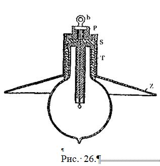 На Рис. 26 представлена более совершенная компоновка элементов, использованная в конструкциях некоторых из этих ламп. Такая конструкция ламп показана и описана ранее, когда делались ссылки на Рис. 19. Цинковый лист Zс трубкой Тнадет на металлическое гнездо S.Лампа подвешена на клемме t. Цинковый лист Zвыполняет двойную функцию: усилителя и отражателя. Отражатель отделен от клеммы tнасадкой изолирующей пробки Р.
