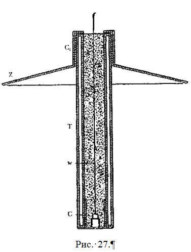 На Рис. 27 представлено похожее расположение компонентов со светящейся трубкой. Трубка Тсделана из двух коротких трубок разного диаметра с запаянными краями. На нижний край нанесено внешнее электропроводное покрытие С, к которому подсоединяется провод W.На конце провода имеется крюк, за который он подвешивается в вертикальном положении. Сам провод проходит через внутреннюю центральную часть трубки, которая заполнена плотно утрамбованным изолирующим материалом. На внешней стороне верхнего края трубки T нанесено другое электропроводное покрытие Сj,на которое надет металлический отражатель Z,Отражатель должен быть отделен от конца провода Wтолстым слоем изолятора.