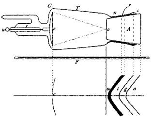 Теперь, если смотреть на экран в направлении от F K T,на освещенном фоне видны темные линии, показанные в нижней части схемы. Кривая линия еи прямая линия W были, конечно, сразу распознаны как соответственно отсветы катода еи дна чашки А,хотя вследствие сбивающей с толку оптической иллюзии они казались гораздо ближе друг к другу, чем они были на самом деле. Например, если расстояние между еи Обыло пять дюймов, то эти линии на экране отстояли примерно на два дюйма, насколько я мог судить на глаз. Эт а иллюзия легко объяснима и довольно неважна, за исключением того момента, что врачу следует держать этот факт в уме, когда он будет проводить обследования с экраном, поскольку, благодаря данному эффекту, который порой вырастает до неимоверной степени, может создаться совершенно неправильное представление о расстояниях между отдельными частями, во вред хирургической операции. Но хотя линии еи W легко были соотнесены [с объектами], изогнутые линии t, g, aсначала озадачили. Вскоре, однако, удалось убедиться, что тусклая линия абыла тенью от края алюминиевой чашки, гораздо более темная линия g— тенью края стеклянной трубки Т,а t — тенью кольца из фольги r. Эти тени на экране Fясно показывали, что агент, который воздействовал на флуоресцентный материал, действовал из пространства, внешнего по отношению к лампе, в сторону алюминиевой чашки, и главным образом из области, через которую проходили испускавшиеся из трубки через окно первичные возмущения или потоки, каковое наблюдение нельзя было объяснить лучшим образом, нежели предположив, что воздух и частички пыли вовне, на пути проецируемых потоков, являются препятствием для их прохождения и порождали удары и столкновения, распространяющиеся через воздух во всех направлениях, производя тем самым непрерывно новые источники лучей. Именно этот факт обнародовал Рентген в его упомянутом ранее сообщении. Так, по крайней мере, япроинтерпретировал его утверждение в сообщении, что лучи исходят из облученного воздуха.