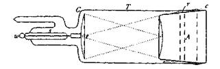 ' После этого я постарался убедиться, было ли необходимым, чтобы препятствие снаружи было, как в данном случае, твердым телом, или жидким, или, вообще, телом заметных размеров, и именно при исследованиях в этом направлении я пришел к результату, о котором я говорил во вводных предложениях настоящего сообщения. То есть, я наблюдал это достаточно случайно, хотя и следовал систематическому исследованию, что проиллюстрировано на схеме Рис. 1. Схема показывает трубку Ленард а улучшенной конструкции, состоящую из трубки Т изтолстого стекла, сужающуюся к одному концу, или шейке И, в которую вставлена алюминиевая чашка Аи сферический катод в,держащийс я на стеклянной ножке S,и платиновой проволочки W,впаянной в противоположный конец, ка к обычно. Алюминиевая чашка А,как будет видно, не находится в реальном контакте с землей — стеклянная стенка находится от последнего на малом расстоянии за счет узкого и сплошного кольца из фольги r. Внешнее пространство между стеклом и чашкой Азаполнено цементом с,способом, который я позднее опишу. F— эт о Рентгеновский экран, такой как обычно используют при проведении наблюдений.