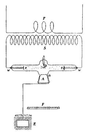 Для того, чтобы выяснить, может ли тело, находящееся вне трубки и на пути или в направлении потока частиц, производить такие же специфические явления, как и тело, находящееся внутри, оказалось необходимым сначала показать, что действительно имеет место проникновение частиц через стенку, или же напротив, что действие предполагаемых потоков, какой бы природы они ни были, достаточно ярко выражено во внешней области, близкой к стенке лампы, чтобы производить некоторые эффекты, которые специфичны для катодных потоков. Было несложно с помощью надлежащим образом сделанной трубки Ленарда, имеющей чрезвычайно тонкое окно, получить множество, и сначала удивительных, доказательств такого характера. Некоторые из них уже были отмечены, и, полагаю, будет достаточно изложить здесь еще одно, которое я наблюдал впоследствии. В полой алюминиевой чашке А трубки, показанной на схеме Рис. 1, которую я подробно опишу, я поместил кусок серебра размером в пол-доллара, так чтобы он удерживался полосками слюды на малом расстоянии от окна или дна чашки и параллельно ему таким образом, чтобы он не касался металла трубки, и вокруг него везде оставался воздушный зазор. По возбуждении трубки в течение примерно 30 —4 5 секунд вторичным разрядом мощной катушки нового типа, сейчас уже хорошо известного, обнаружилось, что кусок серебра становился таким горячим, что буквально жег руку; хотя алюминиевое окно, которое представляло собой весьма незначительное препятствие катодному потоку, становилось лишь чуть-чуть теплым. Таким!образом, было показано, что серебряный сплав благодаря его плотности и толщине, отбирал основную часть энергии удара в процессе воздействия на него частицами практически идентично тому, как если бы он находился внутри лампы, и, более того, в результате наблюдения теней были получены указания на то, что он вел себя как второй источник лучей, в той мере, что очертания теней, вместо того чтобы быть резкими и ясными как будет если убрать пол-долларовый кусочек, они тусклые. Дл я главной цели данного исследования было несущественно выяснять с помощью более точных методов, действительно ли катодные частицы проникают через окно, или же с внешней стороны окна проецируется новый и отдельный поток. У меня нет ни малейшего сомнения, что имеет место первое, поскольку в этом отношении я мог получить множество дополнительных доказательств, которые я может быть изложу в ближайше м будущем.