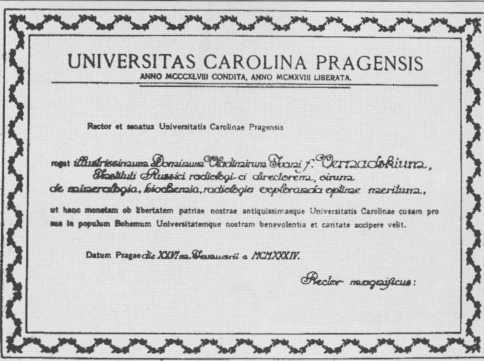 Диплом об избрании В. И. Вернадского почетным членом Карлова университета в Праге