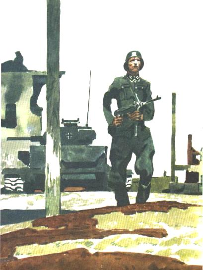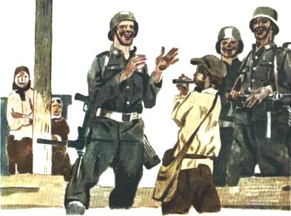 Он вынул гармошку и, подойдя к группе солдат, стал наигрывать немецкую песенку. Он фальшивил, немецкий солдат начал подпевать, поправляя его, к нему присоединились и другие. Витю окружили. Он заиграл «Катюшу».