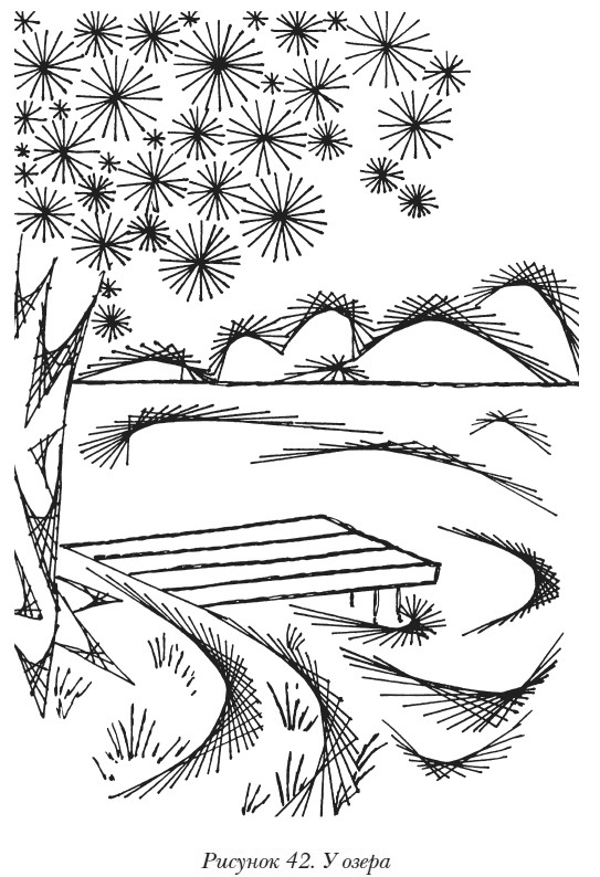 б) верхний правый угол моря сделать простыми белыми короткими горизонтальными стежками, среднюю часть — бледно-голубыми слегка искривленными дугами, ближайшую к берегу — синими дугами, слегка повторяющими изгибы берега. При этом переход от одного оттенка к другому должен быть плавным.