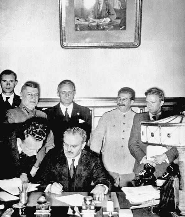 Глядя на то, как Гитлер разжигает войну в Европе, и опасаясь за безопасность Советского Союза, Сталин в 1939 г. в поисках потенциального союзника обратился к Великобритании. Однако ответ британцев оказался настолько расплывчатым, что, когда Гитлер сделал неожиданное предложение Сталину, тот не колебался. 23 августа 1939 г. советский и германский министры иностранных дел Вячеслав Молотов и Иоахим фон Риббентроп, встретившись в Москве, подписали Договор о ненападении. То, что две диаметрально противоположные идеологии заключили соглашение в духе гетевского Фауста, ошеломило западные демократии. Отныне Гитлер был волен осуществить свой план захвата Польши, не опасаясь вмешательства Советского Союза. Что он и сделал 1 сентября того же года. Через два дня Великобритания и Франция объявили войну Германии. Началась Вторая мировая война.