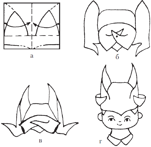 Горизонтально расположенный лист бумаги формата A3 поделить пунктиром на 2 равные части. Затем провести вспомогательную горизонтальную линию на расстоянии 6–7 см от нижнего края листа. Нарисовать контуры ушей, сделать надрезы согласно схеме, приведенной на рис. 1 а, б. Склеить основание шляпы (рис. 1 б, в), отогнуть остроконечные «ушки» и «рога» (рис. 1 г). При желании шляпу можно раскрасить в любой цвет.