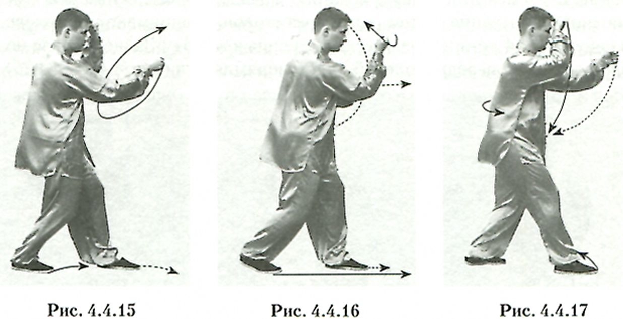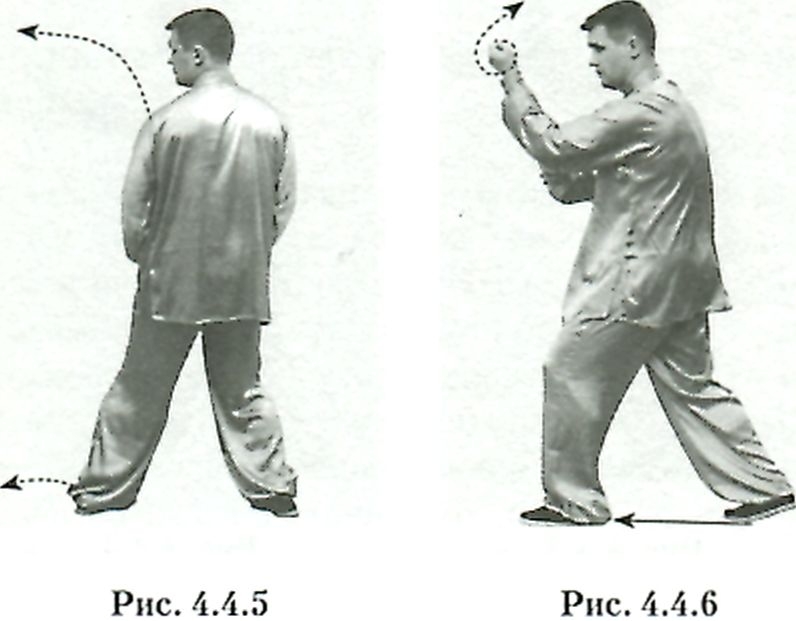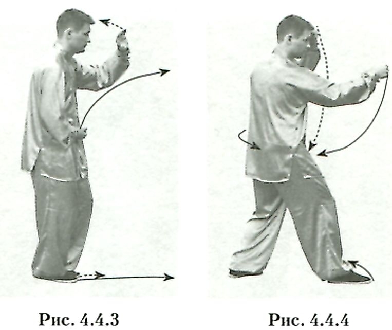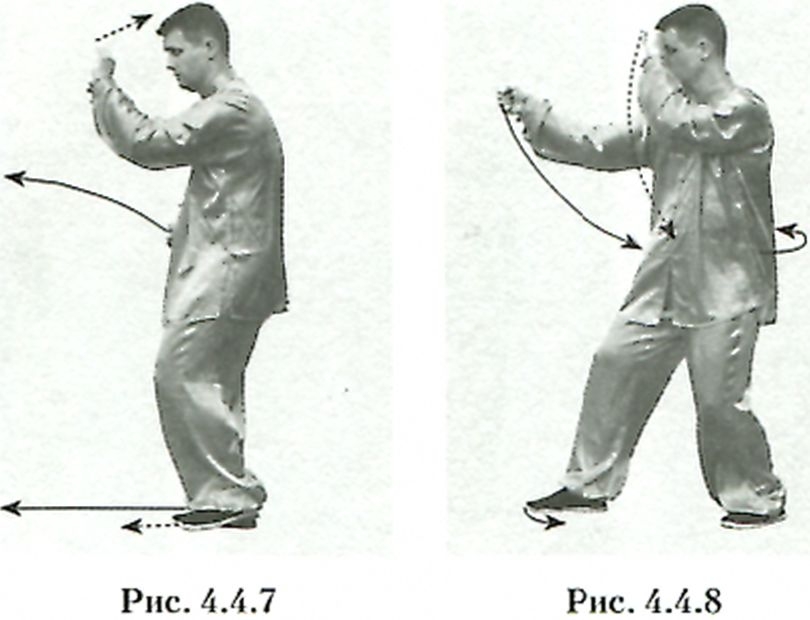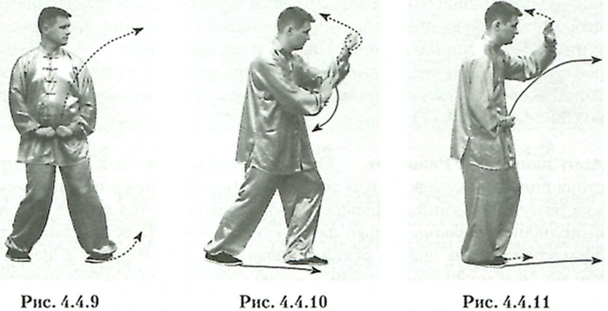 Не останавливаясь, левая ладонь, поднявшись на высоту лба, сжимается в кулак, локти направлены вниз. Правой рукой наносим прямой удар на уровне груди. Одновременно с этим движением импульс, идущий от поясницы и бедер, приходит в правую ногу, достигает колена и проходит в стопу. Следуя ему, делаем большой шаг вперед правой ногой и подшаг левой. Взгляд направлен на верхнюю часть правого кулака. При выполнении этой формы ци накапливается в нижней части живота и затем передается в удар правым кулаком с шагом вперед правой ногой. Для этого движения рук и ног, верха и низа должны быть абсолютно синхронны и целостны (рис. 4.4.1– 4.4.4).