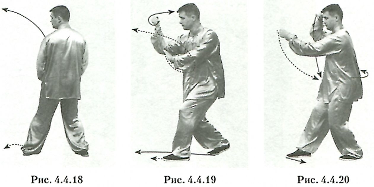 Аобу паоцюань. Разворот. Обе руки подтягиваются к животу, правая стопа поворачивается носком вовнутрь. Мы оказались в позиции коубу - «застегнутой» позиции. Дальше разворот выполняется так же, как и при выполнении пицюань, только на другую сторону. Не останавливаясь, делаем цзуаньцюань правой рукой и паоцюань– левой рукой с шагом правой ногой и подшагом - левой. Способ работы тела и метод передвижения описаны выше. Движения на правую и левую стороны и требования,предъявляемые к ним, абсолютно идентичны. Продолжаем отрабатывать упражнение на обе стороны. Количество выполнения форм остается на ваше усмотрение. Приходим в исходную позицию и снова разворачиваемся (рис. 4.4.18-4.4.20).