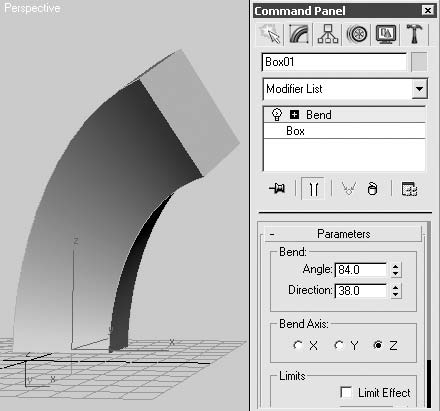 4. В свитке Parameters (Параметры) подберите желаемые значения параметров Angle (Угол) и Direction (Направление), задающих величину изгиба и угол поворота габаритного контейнера модификатора.