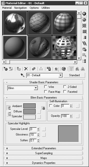 Окно Material Editor (Редактор материалов) содержит собственную панель инструментов, расположенную снизу и справа от ячеек с материалами: