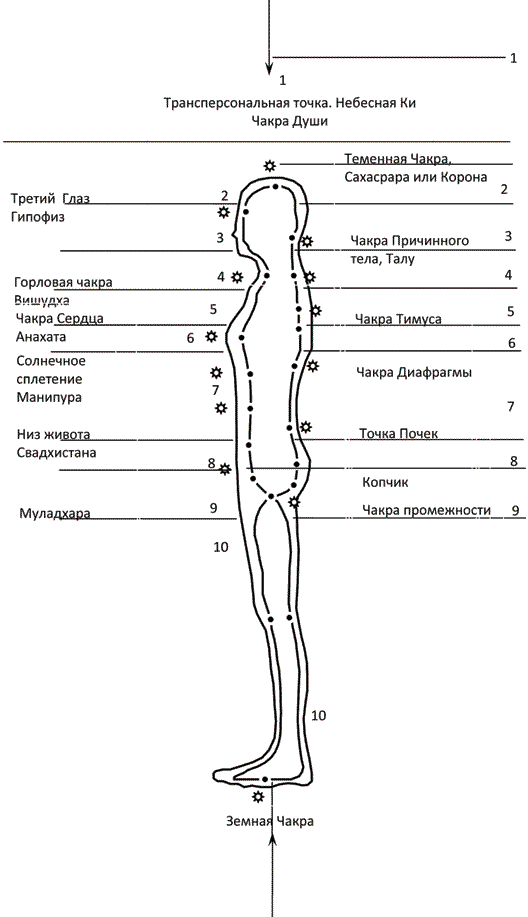 На рисунке вы видите некие линии, пересекающие тело в местах энергетических центров, или чакр. Эти линии, конечно, условны, потому что в человеческом организме ничто не отделено ни от чего, всё связано. Однако такое деление оправданно. Каждая из выделенных зон всё-таки имеет свои особенности, психологические и кармические, которые оставляют «следы» на физическом теле и ауре. Зная эти особенности и оставляемые ими следы, можно заглянуть в причины недугов.