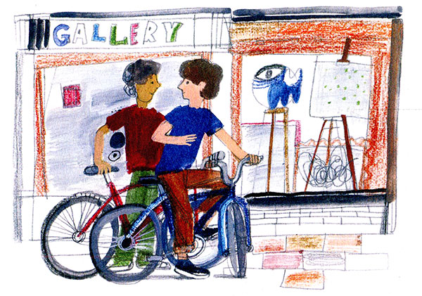 Единственным живым человеком в галерее, кроме нас, была высокая, худая женщина с жирафьей шеей и очень кудрявыми волосами, кудрявей не бывает. Она была очень красивая. Мне нравилась её походка — с высоко поднятой головой и прямой спиной.