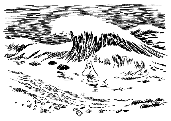Муми-тролль всё ещё ловил свои жемчужины. Он подпрыгивал в волнах, точно пробка, а на берегу уже громоздилась большая куча круглых белых камушков.