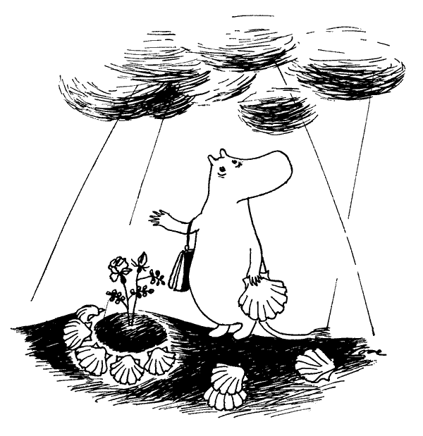 – «Надеюсь, хотя бы не ливень», – подумала Муми-мама, собрала оставшиеся ракушки и вошла в дом как раз в ту минуту, когда с неба упали первые капли.