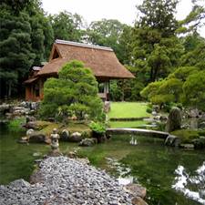 Тем временем мы пришли в садик, который оказался очень японским — маленький ручеек, впадающий в пруд, покрытый лилиями; небольшой горбатый мостик, украшенный фонариками; дорожки из песка и гравия, выложенные камнями необычных очертаний; множество небольших деревьев — в основном хвойные: миниатюрные сосны и туи, а также я заметил пару ив и кленов. Между деревьев — аккуратно подстриженные кустарники. Внутри сада стояли две постройки. В одной я узнал традиционный чайный домик с верандой, а другая, судя по приглашающему поклону жены — оказалась баней.