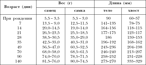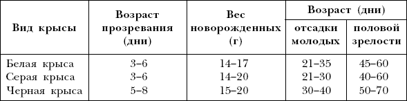 Как уже говорилось, крысы дают до 5–6 пометов в год. Вес новорожденного зверька достигает 3–6 г в зависимости от количества особей в помете. Детеныши крыс растут и развиваются несколько медленнее хомячков, однако они довольно подвижны еще до открытия глаз, что происходит на 14–17-й дни, а к 10-дневному возрасту у детенышей появляются нижние резцы. Полного развития молодые особи достигают через месяц, в это время их уже можно поселить отдельно (табл. 7, 8).