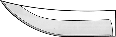 Клинки с прямым лезвием и загнутой в его направлении линией обушка на английском принято называть Wharncliffe blade от фамилии английского лорда, который где-то в начале XIX века заказал мастеру-ножеделу складной нож с именно таким клинком (рис. 21 и фото 22). Таким клинком можно удобно и очень точно строгать, например, затачивать карандаши. Можно что-нибудь вырезать острием. Для абсолютного большинства выполняемых ножом работ такой клинок не слишком подходит, но красиво, изящно выглядит. Поэтому клинки такого типа остаются, главным образом, уделом небольших парадно-выходных складных ножиков, часто именуемых джентльменскими (gentleman folder).