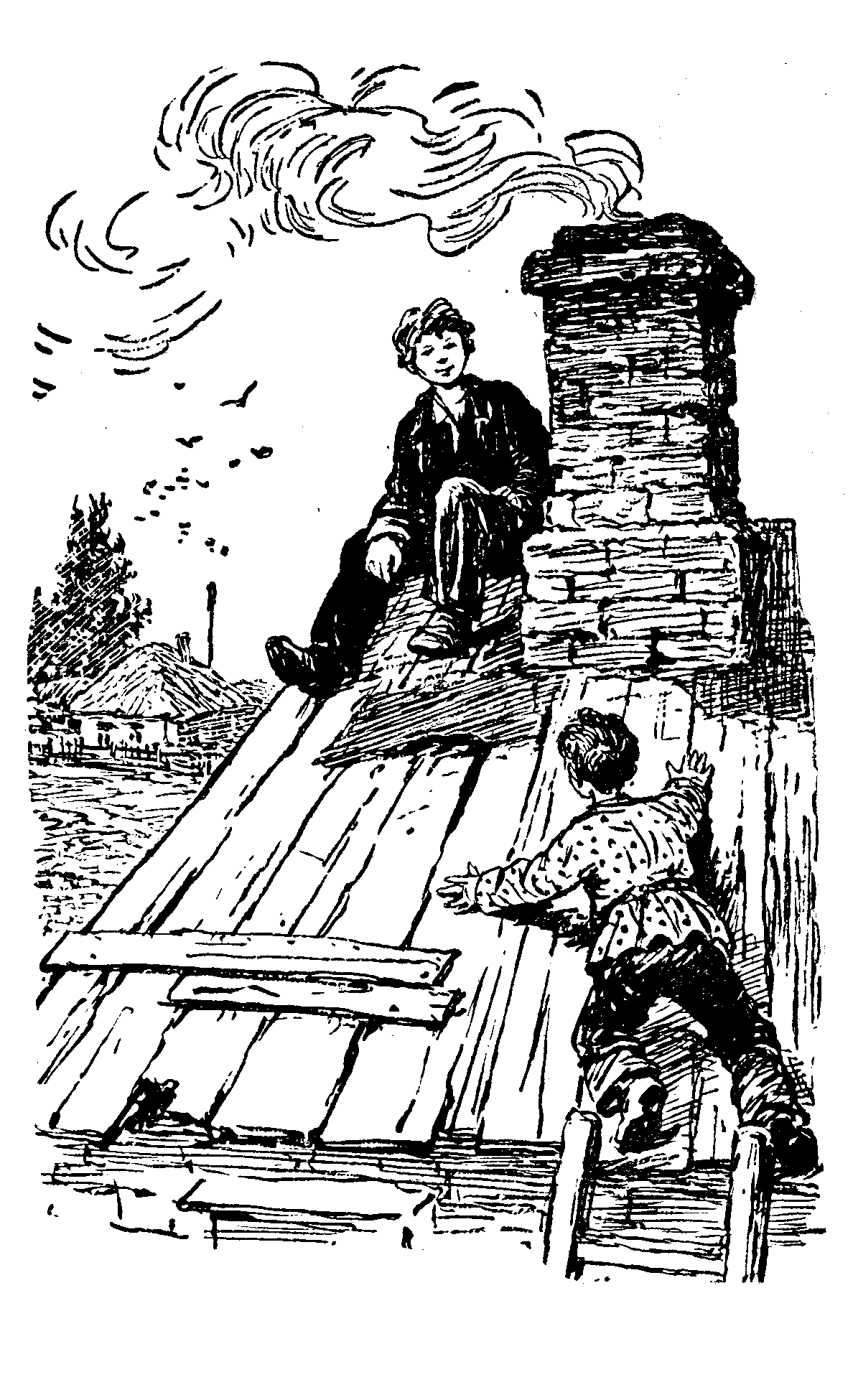 Я поднял голову и увидел на закопченной крыше Ильку. Одной рукой он держался за трубу, а другой показывал мне на деревянную приставную лестницу.