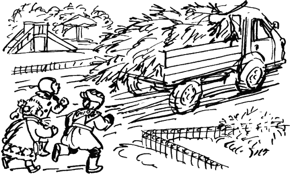 Недавно мы гуляли во дворе: Аленка, Мишка и я. Вдруг во двор въехал грузовик. А на нем лежит елка. Мы побежали за машиной. Вот она подъехала к домоуправлению, остановилась, и шофер с нашим дворником стали елку выгружать. Они кричали друг на друга: